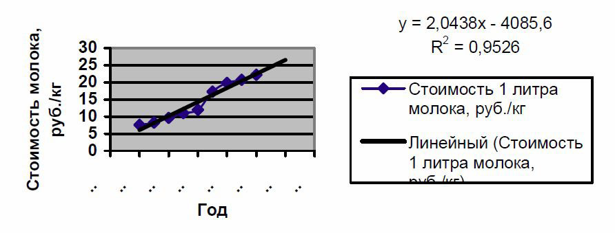 Для этой цели целесообразно установить зависимость изменения цен на молоко с использованием временного фактора. Так как для получившегося уравнения коэффициент детерминации близок к единице, то полученное уравнение можно использовать для прогнозирования. Получившаяся линия тренда свидетельствует о том, что к 2012 году цена на молоко в Вологодской области повысится до 26,53 руб., что показывает возможность увеличения цен по сравнению с 2010 годом на 19,7 %.