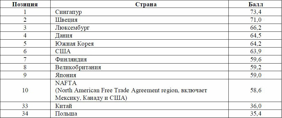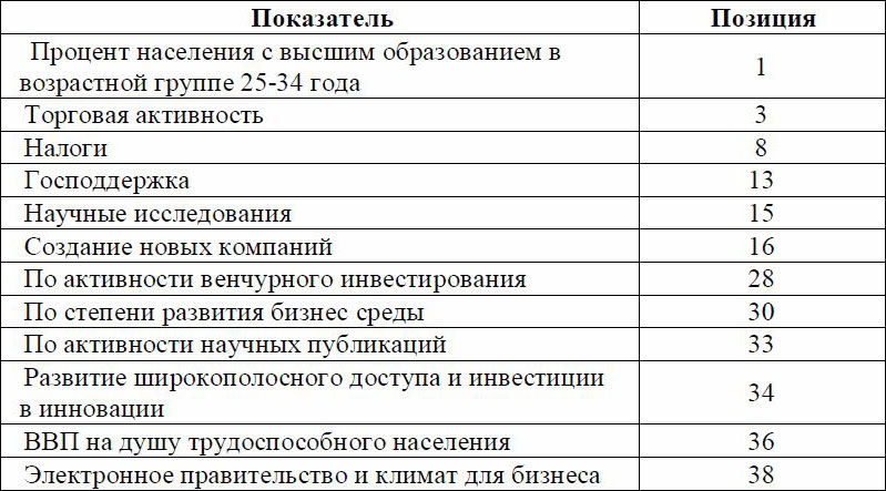 Таблица 1. Рейтинг инновационности в 2009 году [5]