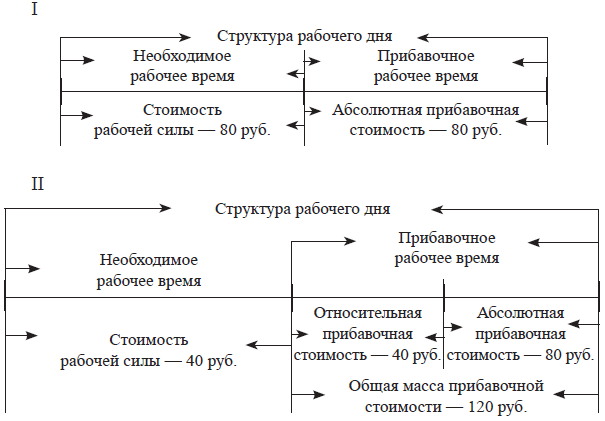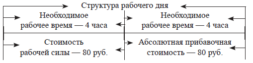 Рабочий день распадается на необходимое и прибавочное рабочее время при любой продолжительности рабочего дня. Этот феномен рабочей силы вытекает из её общей особенности – создавать новую стоимость большую, чем она сама стоит в любой промежуток времени. К. Маркс по этому поводу пишет, что «удлинение рабочего дня за те границы, в которых рабочий был бы в состоянии произвести только эквивалент стоимости своей рабочей силы, и присвоение этого прибавочного продукта капиталистом – вот в чём состоит производство абсолютной прибавочной стоимости» (Маркс К. Капитал. Т.1. М., 1967. С. 518).