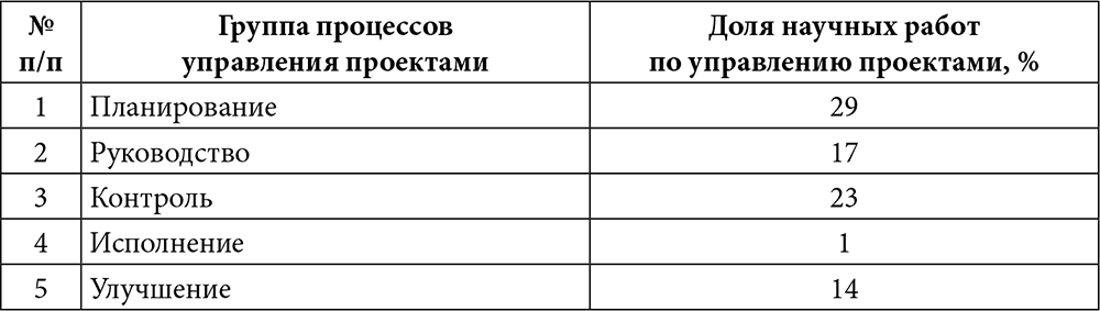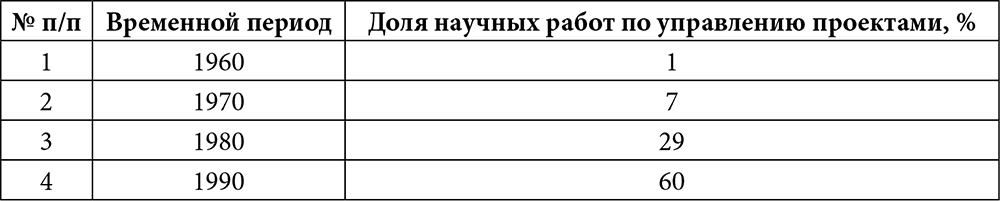 Анализ эволюции научных исследований по управлению проектами был проведен группой ученых под руководством проф. Т. Клоппенборга (Xavier University, США). В ходе исследования были проанализированы 3554 работы по управлению проектами за 1960–1999 гг., причем рассматривались только англоязычные научные статьи и монографии, имеющиеся в библиотеках США. Результаты исследования приведены в табл. 1.2–1.5.