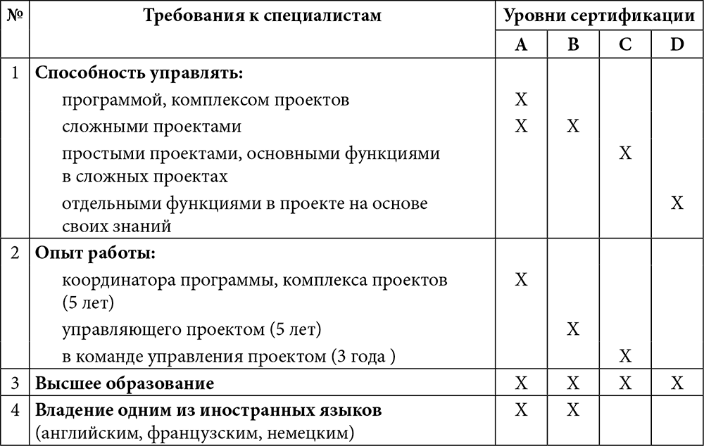 Требования, предъявляемые к специалистам по управлению проектами разных уровней сертификации, приведены в табл. 2.1.