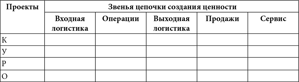 • формирования проектов по наиболее значимым SWOT-составляющим в разрезе элементов цепочки создания ценностей.
