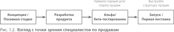 Применять модель разработки продукта для развития потребителей – это все равно что пользоваться часами, чтобы узнать температуру. Что-то вы измерите, но совсем не то, что хотели. Рисунок 1.2 показывает, как выглядит схема разработки продукта с точки зрения продажников. Вице-президент по продажам смотрит на схему и говорит: «Хм. Если бета-тест назначен на эту дату, не помешало бы иметь небольшую команду продавцов заранее, чтобы приобрести первых «ранних клиентов». И если дата выпуска первой версии продукта вот в этот день, то мне нужно нанять и укомплектовать департамент продаж к этому времени». Почему? «Ну, потому что план поступлений, согласованный с инвестором, предусматривает начало поступлений от продаж с момента получения первой версии продукта потребителем».