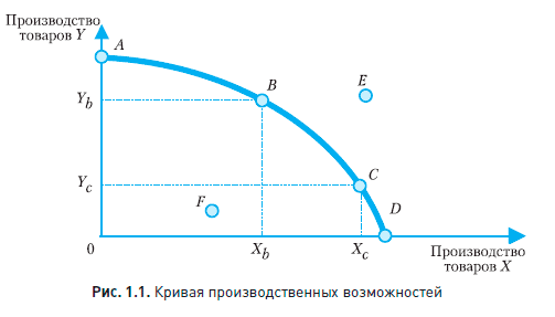 Если все ресурсы рассматриваемой экономической системы (общества, фирмы и т. д.) используются только для производства товара Y, то экономика находится в точке А, т. е. максимально возможный объем производства товара Y равен отрезку ОА, а максимально возможный объем производства товара X – нулю. Соответствующим образом, если все экономические ресурсы используются только для производства товара X, то экономика находится в точке D (это означает максимально возможное производство товара X в объеме OD и товара Y – в нулевом объеме).