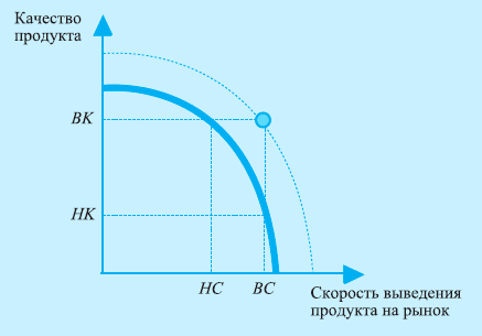 При этом, по оценке американских экспертов, денежные потери в случае ускорения процесса на этапе разработки продукта значительно меньше, чем упущенная из-за промедления выгода. В начале 1990-х гг. месячное опоздание с выходом на рынок для компании с оборотом продаж 100 млн долл США в год означало потерю 100 тыс. долл. Сегодня время стоит еще больше. Рассмотрим дилемму «время – качество» на примере модели кривой производственных возможностей. Модель КПВ строится для заданного объема денежных затрат. При существующих у компании финансовых ограничениях можно выбрать либо стратегию высокого качества (ВК) и низкой скорости выведения продукта на рынок (НС), либо, напротив, пожертвовать качеством (низкое качество, НК), но обеспечить максимальное сжатие времени (ВС) до рынка. Очевидно, и тот и другой варианты имеют свои серьезные недостатки. Практика зарубежных и российских компаний показывает, что увеличение издержек с целью ускорения разработки позволяет, как показано на рисунке, сместить кривую вправо вверх. Компания добивается быстрого выведения продукта на рынок, но не в ущерб его качеству.