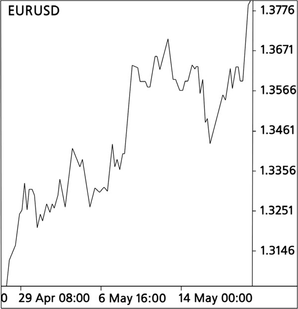 Цена евро выросла, и в середине мая от торговой системы поступил сигнал на закрытие (close) этой сделки (позиции). Трейдер продаёт (sell) купленные в конце апреля евро по более высокой цене, а именно по 1,3650 долларов за 1 евро (цена bid), тем самым фиксируя прибыль. Момент закрытия сделки указан на графике галочкой.