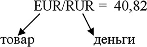 Базовую валюту образно называют товар. Валюту, как и любой товар, можно купить или продать. В данном примере 1 евро стоит 40 рублей 82 копейки (на 7.01.2011).