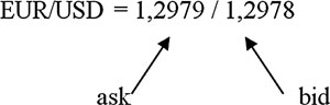 То есть, если в данный момент времени вы хотите купить евро за доллары, то вы сможете это сделать по цене 1,2979$ за 1 евро. А если вы хотите продать евро за доллары, то вы сможете это сделать по цене 1,2978$ за 1 евро.