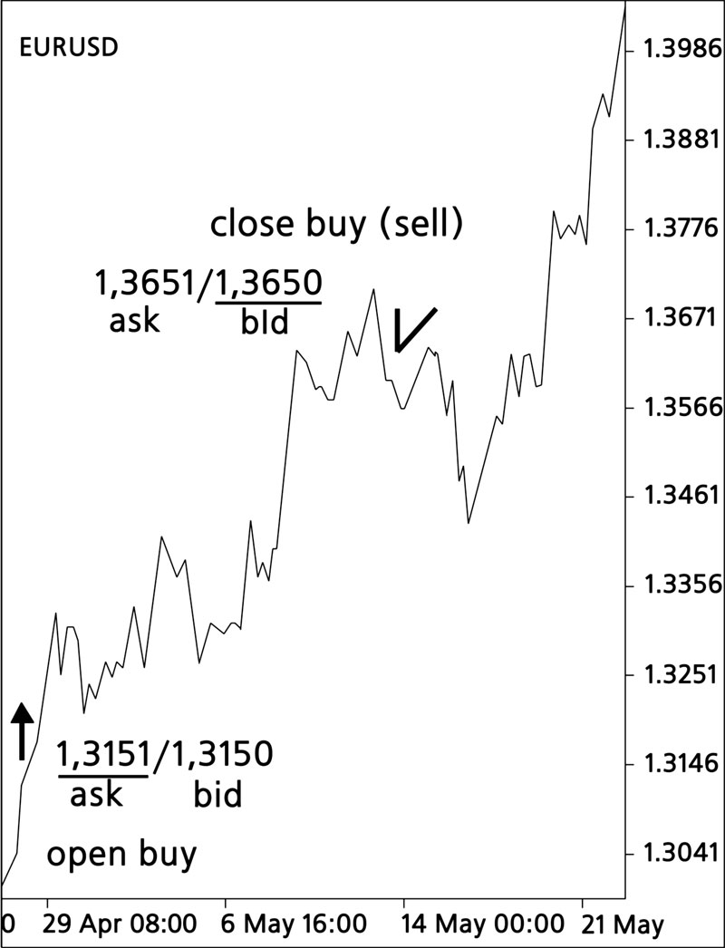Прибыль трейдера составила 1,3650 – 1,3151 = 499 пунктов. Если бы трейдер купил евро по цене ask (1,3151) и продал бы потом тоже по цене ask (1,3651), то прибыль составила бы 500 пунктов (столько пунктов реально цена прошла вверх на графике). Но по вышеуказанным условиям трейдер может продать евро только по цене bid (1,3650). То есть 1 пункт от этой сделки в виде прибыли забирают банк-брокер с брокерской компанией, услугами которых трейдер воспользовался.