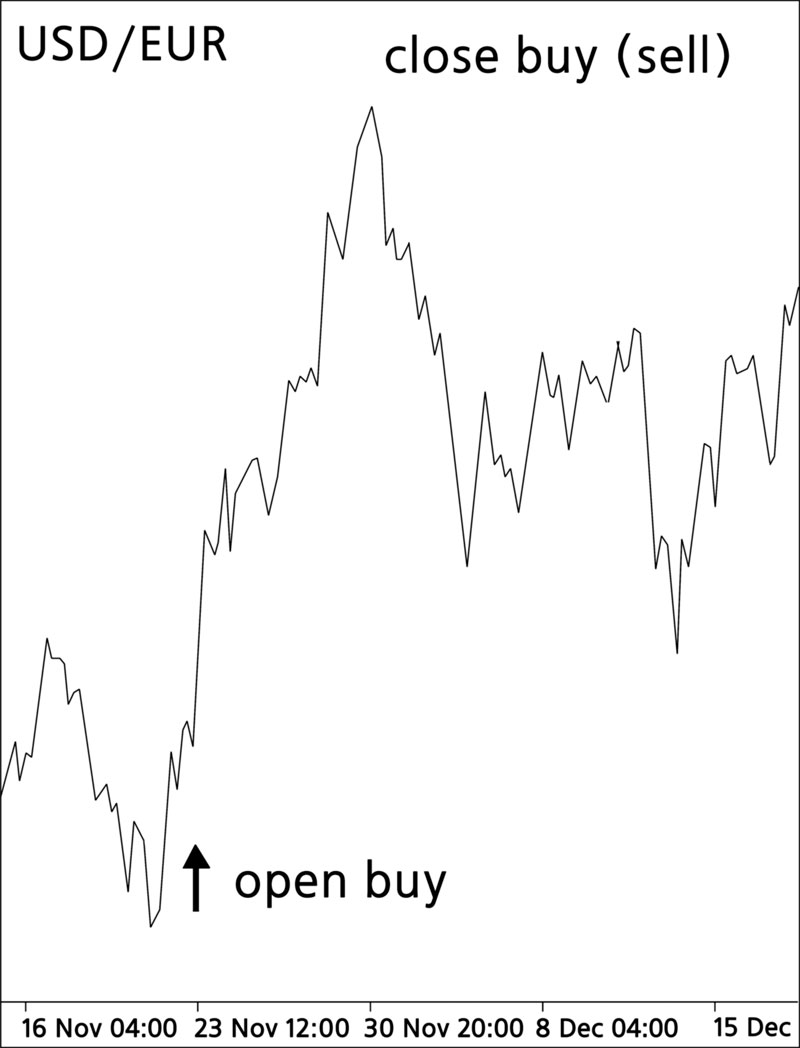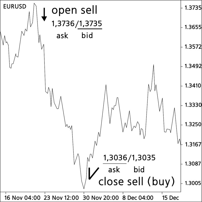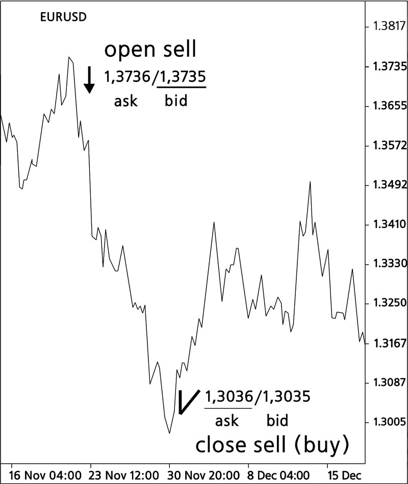 Цена евро упала, и трейдер 1 декабря закрывает (close) сделку на продажу (sell), другими словами, выкупает (buy) этот 0,1 лот евро назад по цене 1,3036 долларов за 1 евро. То есть меняет назад доллары на евро по более низкому курсу (1,3036). При этом часть долларов у трейдера в виде прибыли остаётся, так как цена евро упала: трейдер возвращает с рынка свой 0,1 лот евро (10 000 евро), но платит за него уже меньше долларов – 13 036 долларов. Прибыль составляет 13 735 – 13.036 = $699.