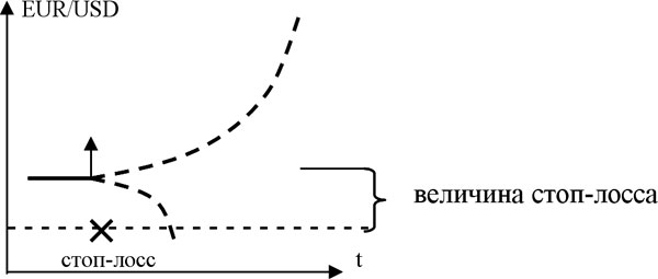 Трейдер ожидает рост цены и покупает евро (стрелка вверх на рисунке А). Сразу после этого он устанавливает ордер стоп-лосс (обозначен крестиком) на уровень ниже уровня покупки. Если цена после открытия сделки пойдёт вверх, трейдер будет в прибыли. А если цена после открытия сделки пойдёт вниз и достигнет уровня, на котором установлен стоп-лосс, то сделка закроется с небольшим убытком, равным величине стоп-лосса (в пунктах). Совершится продажа по ордеру.