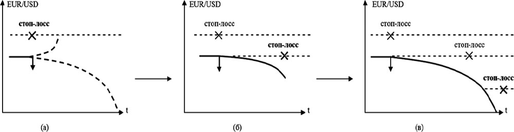 Если после открытия продажи (а) цена прошла вниз на определённое количество пунктов (б), то ордер s/l можно переместить на уровень открытия сделки. В этом случае, если цена вдруг резко развернётся вверх и s/l сработает, то убытка уже никакого не будет, так как сделка по данному ордеру закроется на уровне открытия. Если же цена и далее будет падать (в), то s/l можно переместить ещё ниже, и если он в дальнейшем сработает, то сработает с прибылью, так как закрытие сделки произойдёт ниже цены открытия.