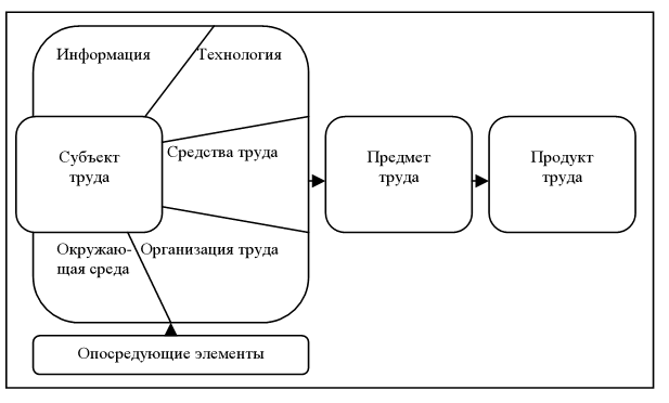 Любой трудовой процесс имеет своей целью создание продукта труда (товаров, услуг, материальных и духовных ценностей), предназначенного для потребления. Для того, чтобы трудовой процесс мог осуществиться, необходимо наличие трех элементов: субъекта труда, предмета труда, средств труда. Элементы трудового процесса показаны на рис. 5.