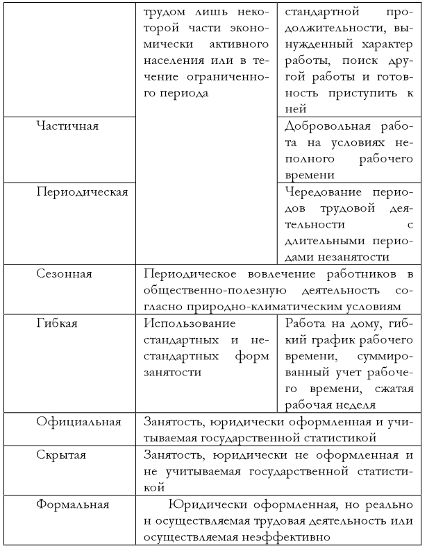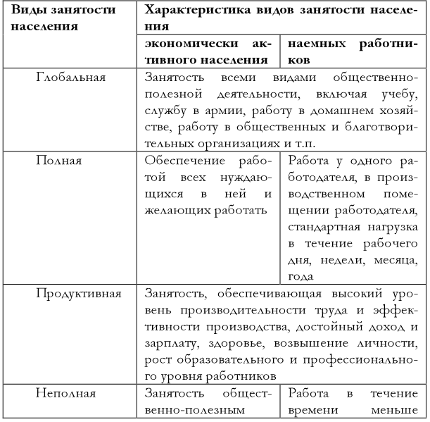 В зависимости от количественных и качественных характеристик различают несколько видов занятости населения, краткая характеристика которых приведена в табл. 1.