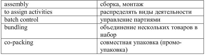 возврат товаров; емкость; заранее упакованный продукт; использованный товар; набор; наклеивание ярлыков; наклейка с ценой; окончательный продукт; поврежденный товар; поставка сборных компонентов; принятие заказа; ремонт; сбыт товаров; транзитное оборудование; упаковка и маркировка.