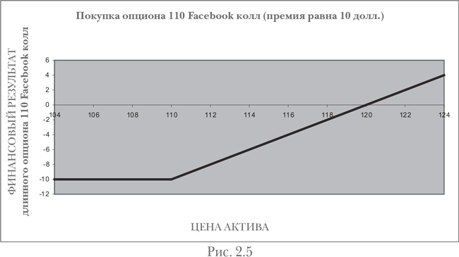 Например, если за право купить акции Facebook по цене 110 долл. вы заплатили 10 долл., то акция должна торговаться на уровне 120 долл., чтобы достичь точки окупаемости. При цене 130 долл. вы получите прибыль 10 долл. [130 долл. – (110 долл. + 10 долл.)].