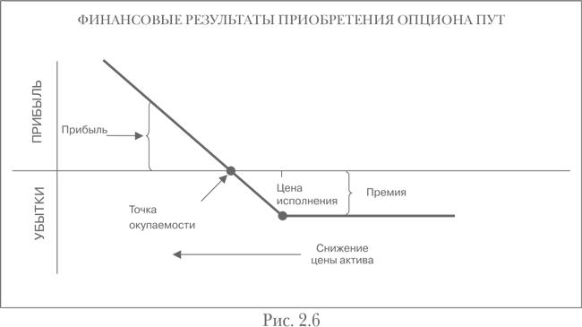 Проанализируем профиль риска купленного опциона пут. На рис. 2.6 видно, что стоимость опциона растет по мере понижения цен. Опцион становится прибыльным только после того, как рынок падает ниже точки окупаемости.