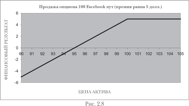 Предположим, вы продали опцион пут на акции Apple с ценой исполнения 100 долл. и получили за этот опцион премию 5 долл. На рис. 2.8 видно, что вы начинаете терять деньги, когда цена опускается ниже 95 долл. Зона вашего риска находится между 95 и 0, а максимальный убыток в этом случае составляет 95 долл.
