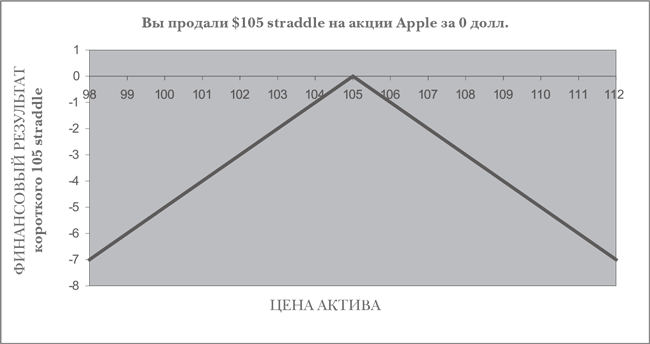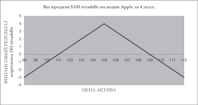 4) Вы продали straddle на акции Apple с ценой исполнения 105 долл. Постройте график вашей (короткой) позиции: