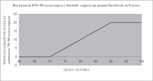 5) Вы купили $70–90 call spread («бычий» спред) на акции Facebook. Постройте график вашей (длинной) позиции:
