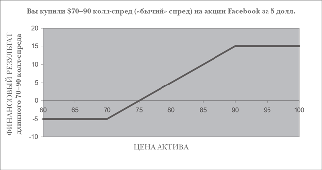 «Бычий» (колл) спред – покупка опциона колл и одновременная продажа опциона колл с более высокой ценой исполнения. Например, вы прибегнете к нему, если полагаете, что цена акций Facebook поднимется выше 90 долл., но не превысит 100 долл. Премия, заработанная на продаже опциона колл с ценой исполнения 100 долл., частично покроет расход на покупку опциона колл с ценой исполнения 90 долл. Однако короткая позиция ограничивает вашу прибыль размерами разницы между ценами исполнения опционов (100 – 90).