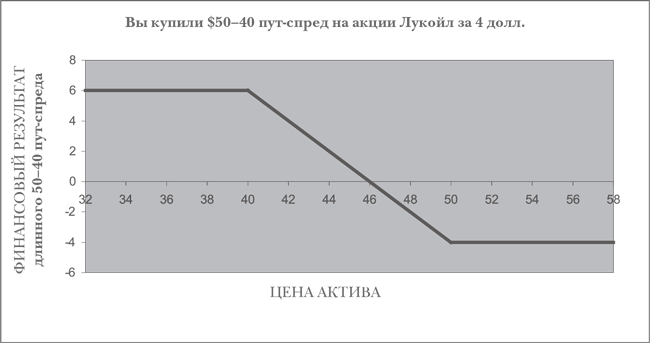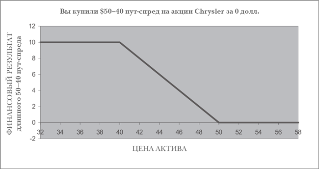 7) Вы купили $50–40 put spread на акции Chrysler. Постройте график вашей (длинной) позиции: