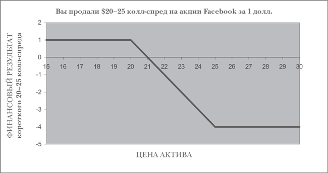 8) Вы продали $20–25 call spread на акции Facebook. Постройте график вашей (короткой) позиции: