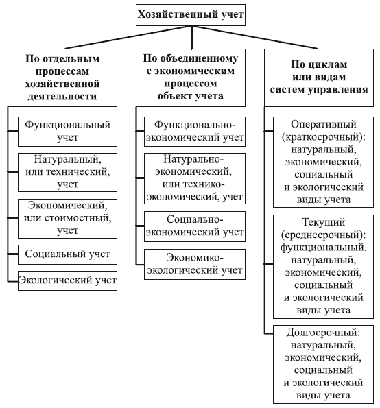 Из предыдущего параграфа видно, что объектом хозяйственного учета является вся хозяйственная деятельность, состоящая из пяти основных взаимосвязанных частей (процессов): функциональных, натуральных, экономических, социальных и экологических. Для отражения фактических результатов этих процессов используются следующие виды учета по названию этих объектов: функциональный; натуральный или натурально-вещественный (технический учет); экономический или стоимостный учет; социальный и экологический учет.