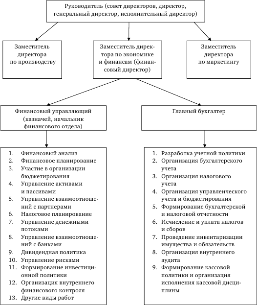 В крупной акционерной компании управление финансами осуществляет финансовый директор. Он несет полную ответственность за результаты ее финансовой деятельности. На небольших предприятиях роль финансового директора выполняет руководитель или, по его поручению, главный бухгалтер.