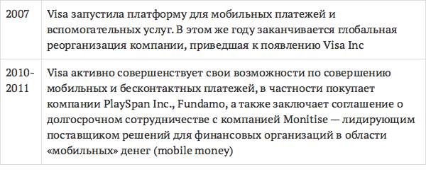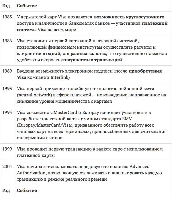 В 1973 году National BankAmericard Inc. (NBI), которая управлялась рядом банков-эмитентов кредитных карт BankAmericard, запускает первую электронную систему авторизации (BASE I), а спустя год – предвестника современной операционной платформы VisaNet (BASE II), то есть электронную клиринговую и расчетную систему. В 1975 году компания выпустила первую дебетовую карту, а через год BankAmericard изменил свое название на Visa, что стало более удобным и одинаково произносимым на большинстве языков (знаковые события в развитии Visa – табл. 4).