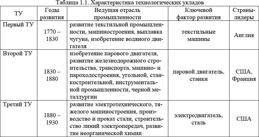На данный момент произошла смена пяти технологических укладов, идет построение шестого ТУ (табл. 1.1). Ядром нового (шестого) ТУ становятся информационно-коммуникационные технологии, нанотехнологии, экологические ноу-хау и т. п.