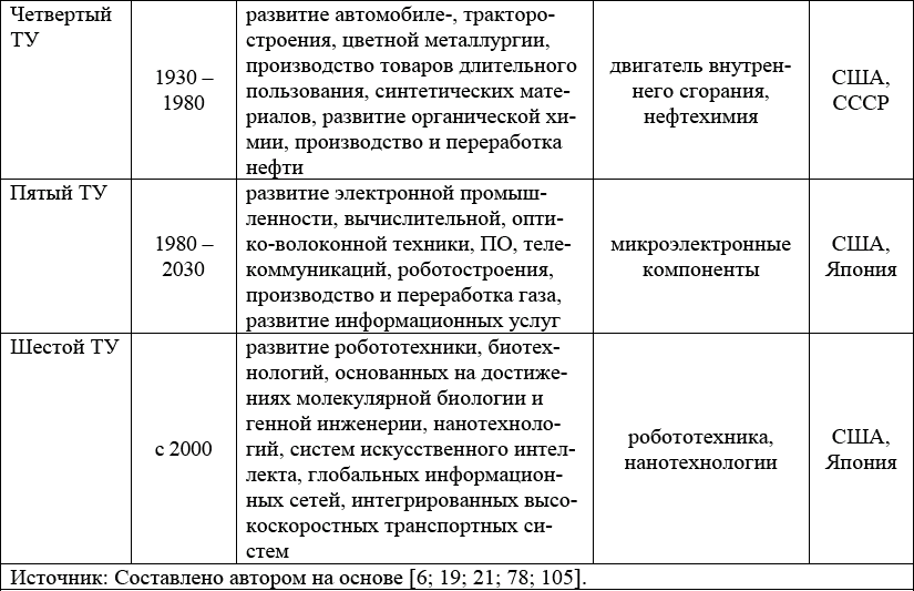 Технологический уклад (ТУ), по мнению авторов [78], – это «группы сопряженных производств, связанных друг с другом однотипными технологическими цепями. В рамках каждого ТУ осуществляется замкнутый производственный цикл, включающий добычу и получение первичных ресурсов, все стадии их переработки и выпуск конечных продуктов».
