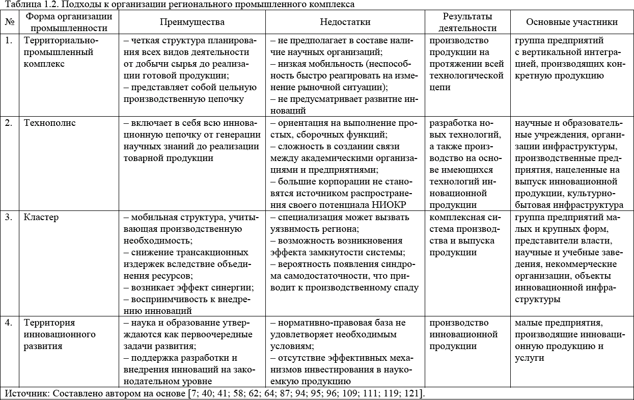 На современном этапе развития существуют различные подходы к организации промышленного производства на региональном уровне. Несмотря на то, что в настоящее время этот вопрос достаточно разработан, существуют определенные расхождения в трактовке понятий и особенностей основных форм организации регионального промышленного комплекса. Основные подходы, а также их характеристика представлены в таблице 1.2 [7; 40; 41; 58; 62; 87; 64; 94; 95; 96; 109; 111; 119; 121].