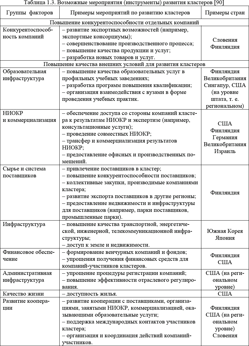 Опыт различных стран свидетельствует об отсутствии единых унифицированных механизмов создания, развития и стимулирования кластеров [135; 137]. Следовательно, для модернизации экономики региона на базе данного подхода необходима разработка обоснованной программы кластерной политики, обеспечивающей поддержку инициатив представителей промышленного комплекса в современных социально-экономических условиях. Выделяют следующие возможные направления поддержки развития кластеров (таблица 1.3).