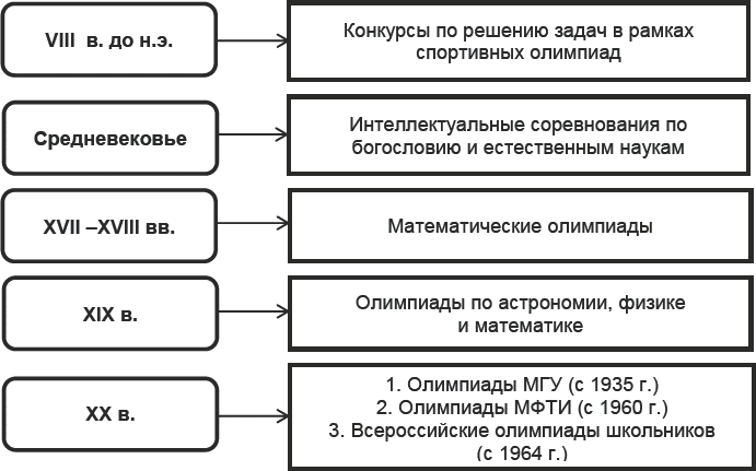 Интеллектуальные соревнования известны в истории с давних пор. Широкое распространение получили математические турниры в Италии в эпоху Раннего Возрождения. С ними тесно связано имя выдающегося математика европейского средневековья Леонардо Фибоначчи. В драматичной истории решения алгебраических уравнений 3-го и 4-го порядков (XIV век) большое место занимали «математические турниры». Причем, необходимо отметить интерес образованной публики к состязаниям подобного рода. Из истории известны аналогичные конкурсы, с которыми связан ряд наиболее значимых открытий в области математики. В ?VII-?VIII веках стали завоевывать популярность «соревнования по переписке», в которых участвовали И. Ньютон, Г.В. Лейбниц, И. Бернулли, Л. Эйлер и другие выдающиеся ученые, что привело, в частности, к зарождению и развитию интегрального и вариационного исчисления. В более поздние времена регулярно проводились всемирные конкурсы на приз Французской Академии Наук (известна победа в таком конкурсе известного российского математика – С.В. Ковалевской). Такие соревнования, как конкурсные экзамены в «Большие школы» Франции, например, в Политехническую и Нормальную, а также знаменитые Кэмбриджские математические экзамены, где главной целью участников являлось получение высокой оценки, также являются, по существу, олимпиадами. Одной из первых предметных олимпиад – прообраза современных массовых соревнований школьников – можно считать Этвешское соревнование в Венгрии в 1896 году.