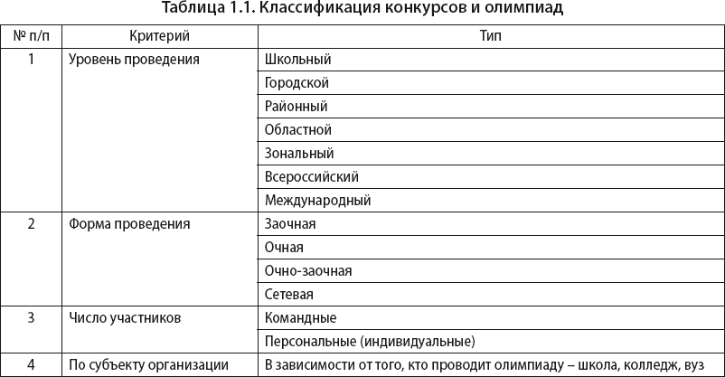 Все конкурсы и олимпиады можно классифицировать по нескольким критериям (табл. 1.1)[18].