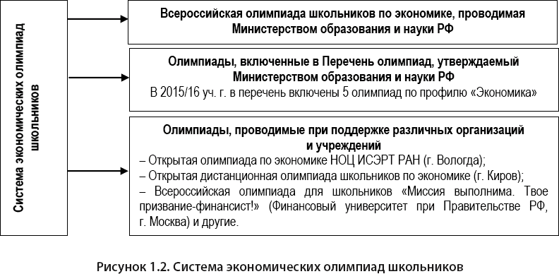 Как упоминалось в пункте 1.1, конкурсы и олимпиады по экономике проводятся в России не так давно по сравнению с такими предметами, как математика, физика или русский язык. Систему олимпиад по экономической тематике образуют Всероссийская олимпиада школьников по экономике; олимпиады, входящие в Перечень олимпиад, утверждаемых Министерством образования и науки; олимпиады, проводимые при поддержке различных организаций и учреждений (рис. 1.2).