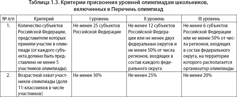 Координирует проведение олимпиад Российский совет олимпиад школьников, а его организационно-техническое и научно-методическое сопровождение деятельности осуществляет общероссийская общественная организация «Российский Союз ректоров». Совет олимпиад ежегодно формирует проект перечня олимпиад, который утверждается Министерством образования и науки РФ. Включение в перечень производится на основе анализа представленных документов, качественных критериев, а также количественных критериев, утверждаемых в зависимости от общего количества участников олимпиады, количества субъектов Российской Федерации, представители которых приняли участие в олимпиаде[27] (табл. 1.2).