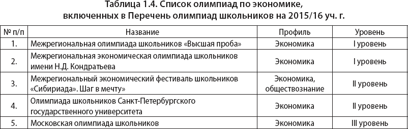 Как упоминалось ранее, в 2015/2016 уч. г. в Перечень олимпиад школьников вошло 5 олимпиад по экономическому профилю (табл. 1.4).