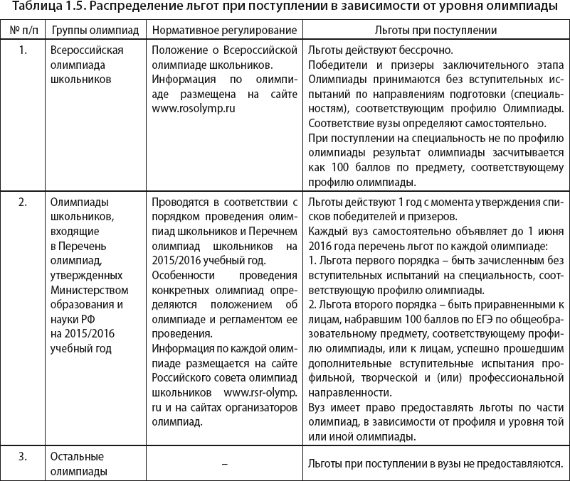 В настоящее время многие школьники заинтересованы в участии в олимпиадах в первую очередь из-за возможностей получения льготы при поступлении в вуз. Данные преимущества даются в зависимости от уровня олимпиады (табл. 1.5).