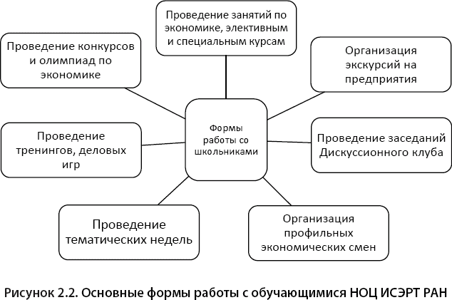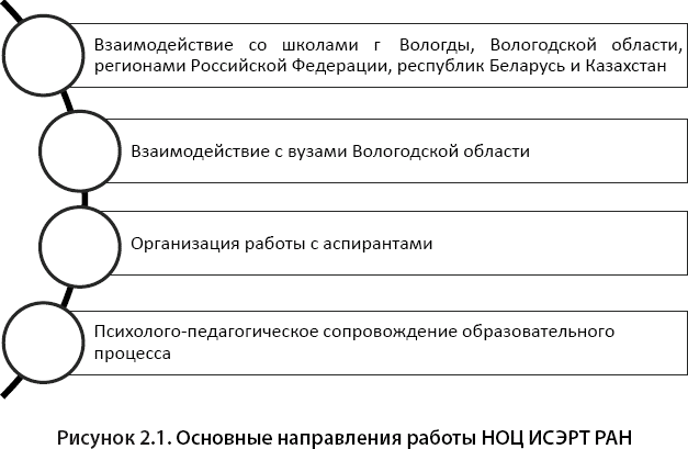 Научно-образовательный центр экономики и информационных технологий ИСЭРТ РАН представляет собой реализацию идеи интеграции научного знания и образования, которая осуществляется через организацию целевой подготовки научных кадров в сфере экономики, управления и информационных технологий по цепочке «школа – вуз – аспирантура». Руководителем данного проекта является директор ИСЭРТ РАН, доктор экономических наук, профессор, заслуженный деятель науки РФ – Владимир Александрович Ильин. Идея, реализуемая в НОЦ, формирует основные направления деятельности Центра (рис. 2.1).