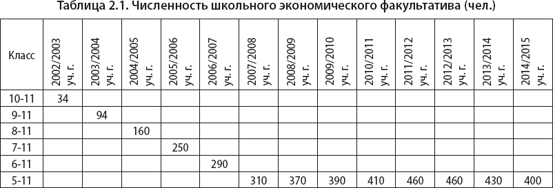К 2014/2015 уч. г. численность обучающихся очного факультатива НОЦ составила 400 школьников 5 – 11 классов (табл. 2.1)[29].