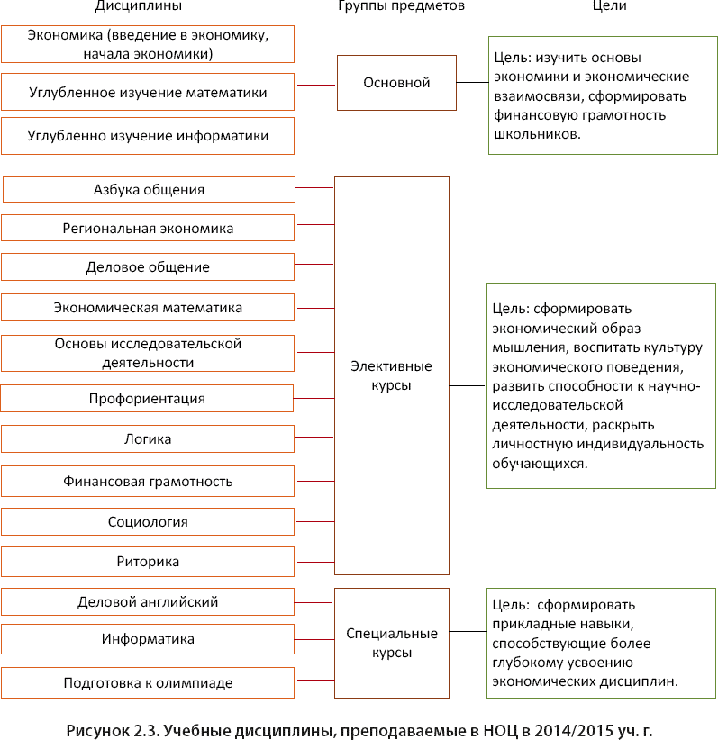 Набор дисциплин, преподаваемых в НОЦ в течение семигодичного цикла обучения школьников в центре, изменяется по мере продвижения учеников от 5 к 11 классу. Это связано с необходимостью углубления знаний, умений и навыков школьников по экономике, воспитания культуры экономического поведения, развития способностей к научно-исследовательской деятельности, раскрытия личностной индивидуальности обучающихся. Новшеством 2014/2015 уч. г. являлось введение таких предметов, как «Углубленное изучение математики» и «Углубленное изучение информатики» (в связи с открытием информационно-математических классов), а также элективных курсов «Логика» в 7-х классах, «Профориентация» в 10-х классах и «Региональная экономика» в 11-х классах (табл. 2.2).