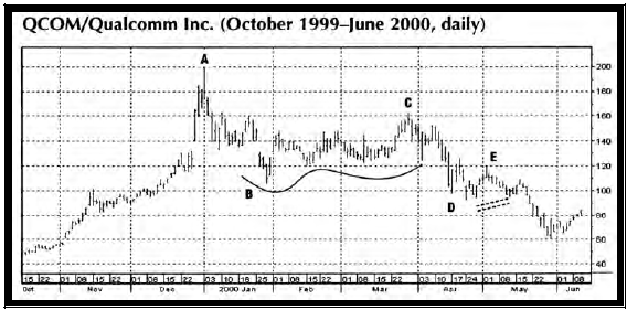 Модель "пружина" возникает, когда рынок прорывает поддержку и затем быстро восстанавливается. На прорыве наблюдается незначительный объем и рынок пытается стряхнуть слабые длинные позиции. Модель "толчок вверх" возникает, когда рынок тестирует верхний уровень торгового диапазона, но быстро встречает избыточное предложение. Каждая из этих моделей означает "отвержение цены" (price rejection) и предоставляет возможность для краткосрочной торговли в противоположном направлении. Ложный прорыв устанавливает хорошо определенный уровень риска, и в общем случае, рынок должен двинуться так, чтобы протестировать противоположный конец торгового диапазона. Рис. 4 показывает пример "пружины" (С) и "толчков наверх" (А и В). Эти ложные прорывы ведут к колебанию в обратном направлении, к другому концу торгового диапазона. (Обратите внимание, что точки D и Е – хорошие примеры "бычьего флага").
