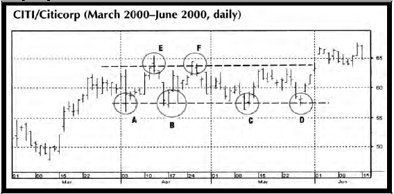 После большого рыночного движения, наступает период консолидации. Множественные "пружины" (А, В, С и D) и "толчки наверх" (Е и F) формируют потенциал для краткосрочной торговли, как показано на Рис. 5.