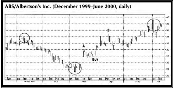 Как показано на Рис. 8, кульминации покупок и продаж отмечают крайние точки. Первый резкий свинг в противоположном направлении, в точке А, предоставляет возможность сделать сделку в длинную сторону к точке В. Рынок поднимается, проводя тестирование максимума предыдущего колебания и находя консолидацию в дальнейшем.