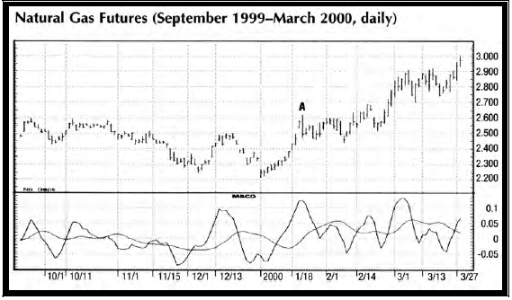 Рис. 9 показывает осциллятор, созданный на основе скользящей средней, который сделал новый максимум в точке А. Импульс предшествует цене. Точка А была первой, лежащей на расстоянии длины колебания вверх, превышающей длину ближайшей предыдущей ветки вниз. Отметьте, какой последовал неуклонный повышающийся тренд.