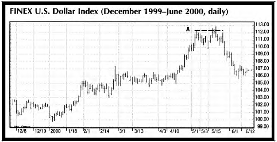 Существует два типа тестов. Первый – тот, который происходит в конце устойчивого тренда. Это "неудачный тест" (failure test), который происходит, когда рынок не может сделать новый шаг наверх или вниз в трендовой обстановке. Это предупреждение о том, что рынок потерял импульс, хотя само по себе это и не говорит об изменении тренда.