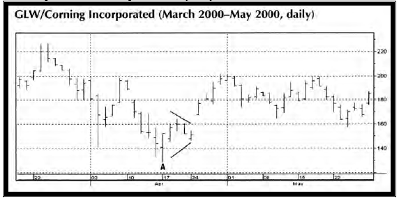 Простые механические системы работы на прорыве стали популярны в 80-х годах и остаются таковыми по сей день. Рис. 14 показывает прорывающий гэп, который последовал за днем с самым узким диапазоном торговли за последние три недели. Гэпы являются формой импульса и ведут к продолжению в направлении закрытия. Обратите внимание на совершенный "тест" в точке А.