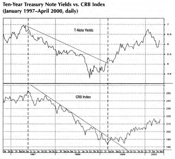 Рис. 15 показывает сравнение Индекса CRB (корзина из 17 товарных рынков) и доходности 10-ти летних казначейских обязательств (10-year Treasury note), которые стали опорной точкой в долгосрочных процентных ставках США. Левая часть графика показывает, что снижение долгосрочных ставок совпадает с падением товарного индекса в течение большей части 1997 и 1998 годов, (поскольку страхи глобальной дефляции выталкивали деньги из товаров для вложения в казначейские облигации и обязательства. Оба рынка начали менять направление в конце 1998 и начале 1999 годов. Хотя доходность 10-ти летних бумаг повернула наверх в четвертом квартале 1998 года, она не смогла прорвать свою двухлетнюю понижающуюся трендовую линию до марта 1999-го. Это случилось в тот самый момент, когда товарный индекс достиг дна и начал повышаться. Баланс 1999 года показал совпадение повышения товарных цен с повышением долгосрочных ставок, так как инфляционные страхи, связанные с повышением цен на товарном рынке, добавили усилий по повышению процентов.